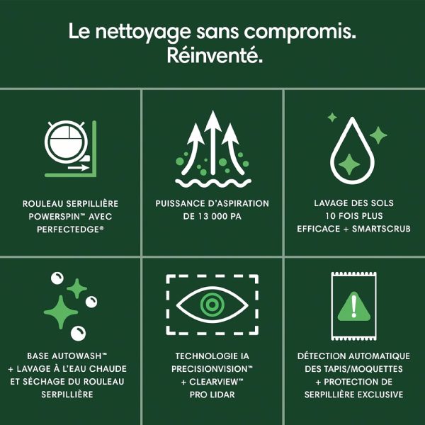 Élimine tous types de saletés, des poils d’animaux aux taches de café, grâce au rouleau PowerSpin™ autonettoyant avec PerfectEdge®, au lavage chauffé, à la technologie SmartScrub, à un système d’aspiration 175 fois plus puissant, aux doubles brosses en caoutchouc et aux doubles brosses latérales.